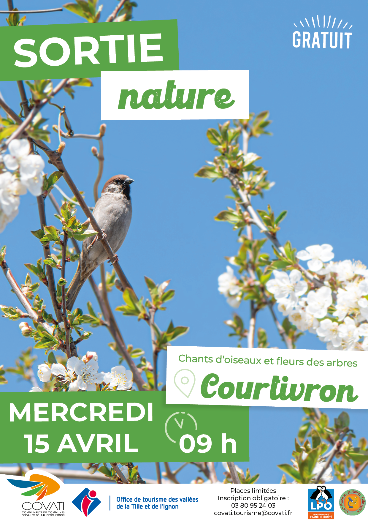 Venez découvrir les chants d’oiseaux et fleurs des arbres, à Courtivron, avec un parcours de 3km aller-retour. Durée : 1h30.