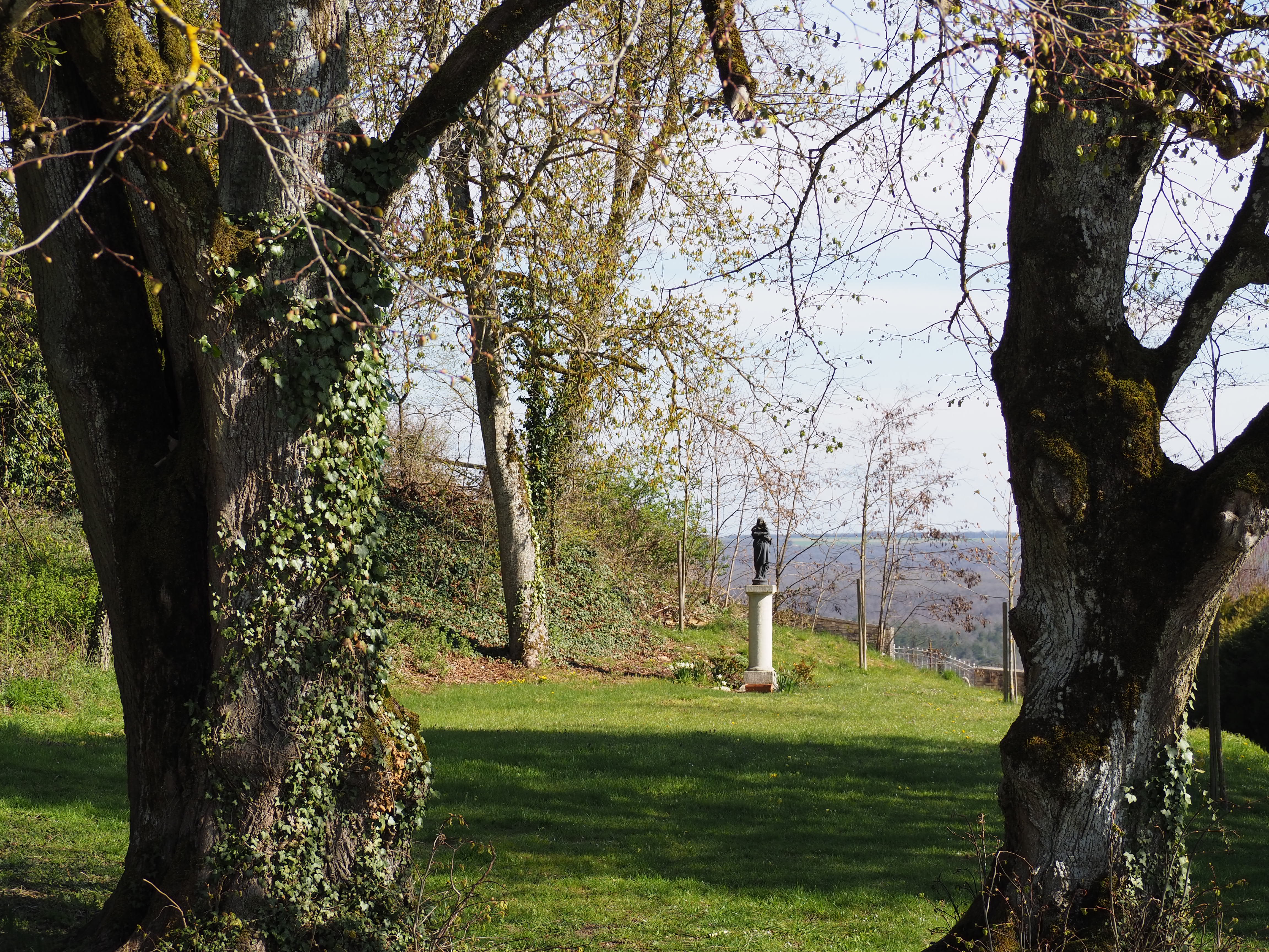 The Place du Marronnier is located halfway up the hill. It owes its name to its superb chestnut tree. Note the presence of two lime trees, a calvary, a statue of the black virgin and a walled garden. The black virgin's statue marks the site of the old church, which was built in 1197 and demolished in 1844. This cast iron statue was made by the Daurenne company. Thanks to his close collaboration with famous artists such as Auguste Bartholdi and Emmanuel Frémiet, he quickly became an important figure in French cast iron art.