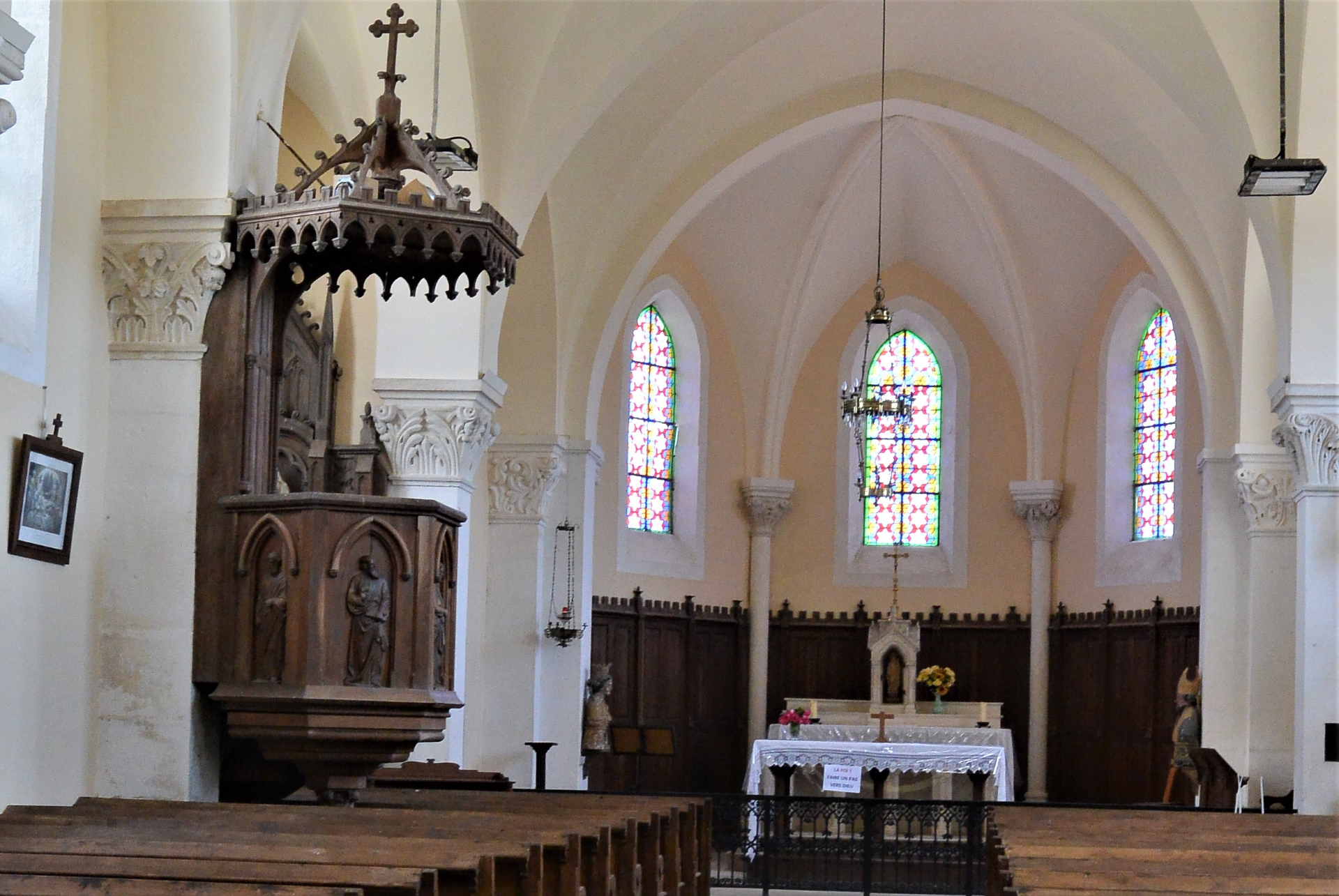 The Notre-Dame's Church. Rebuilt in the middle of the 19th century, the present church is in neo-Gothic style. It was designed during 19th century by the Burgundian sculptor Jules Schanoski (most of the furniture and the stone/wood carvings). Although it has retained some older furnishings too.