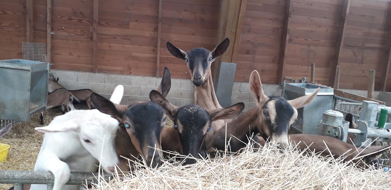 L’exploitation comprend désormais 45 chèvres laitières de race alpine chamoisée. Elles sont nourries en majorité avec le grain, foin, luzerne, paille produis sur les 188ha de SAU de l’exploitation, et pâturent de mars à octobre si le temps le permet.