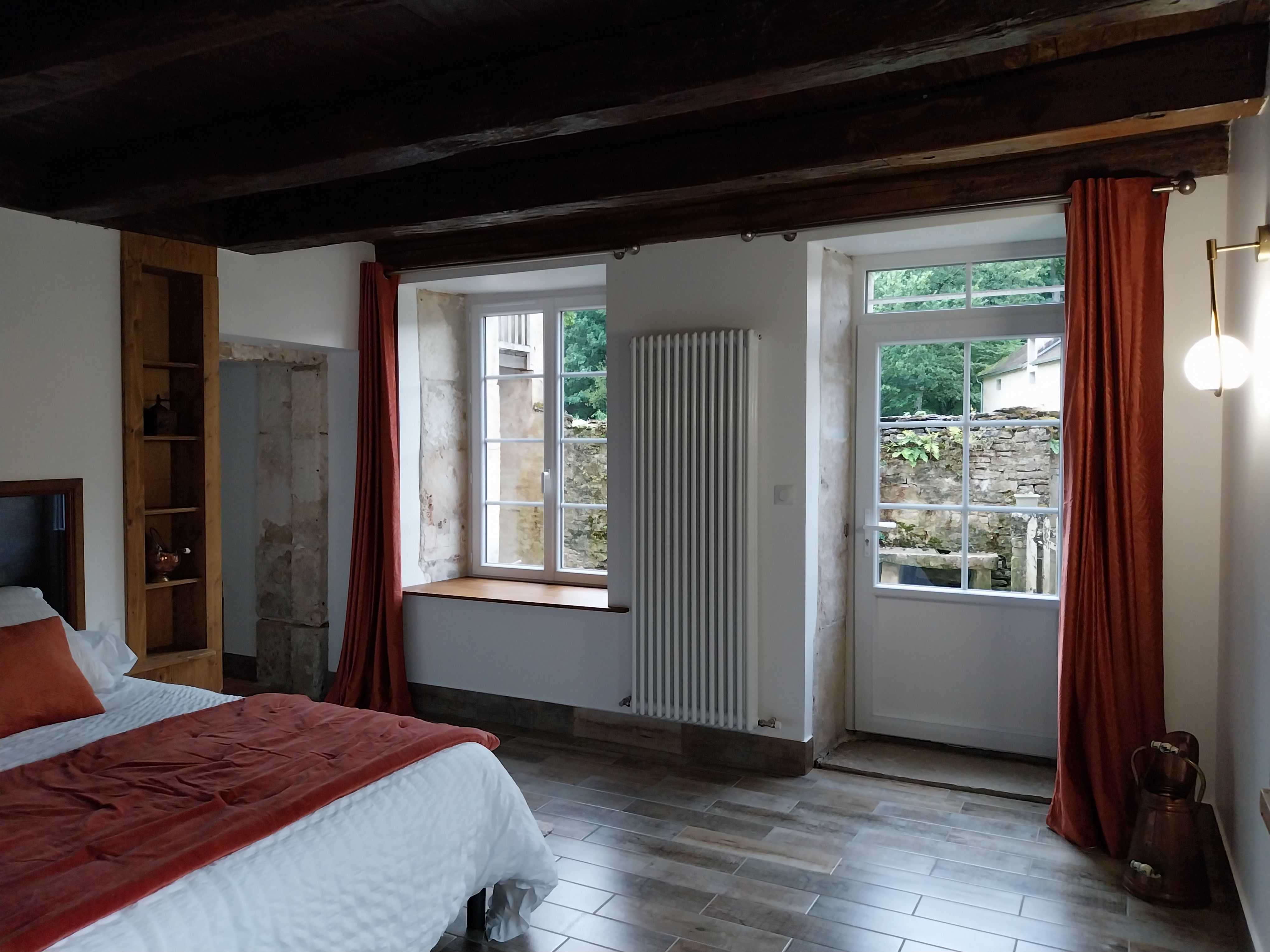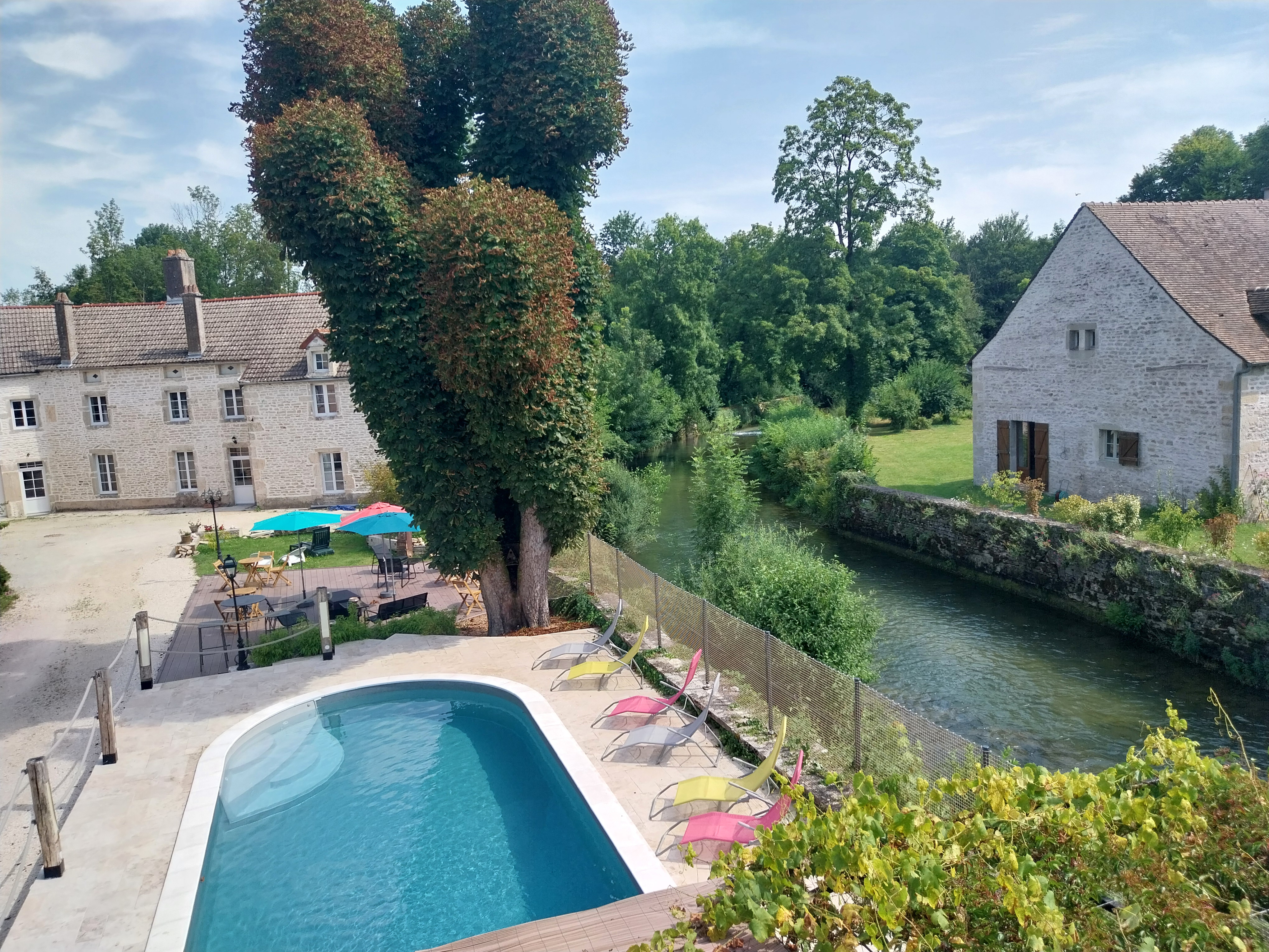 Jardin clos bordé par une rivière, terrasse, salon de jardin, barbecue, zone de stationnement.
